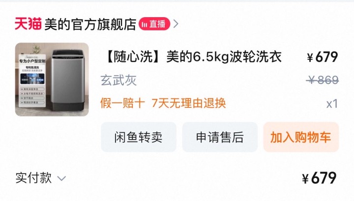 出美的6.5kg洗衣机,350元,可小刀。没有洗过袜子鞋子内衣裤