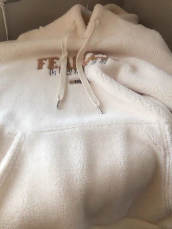 羊羔绒连帽衫,米白色,去年专柜入手,只在家试穿过2次,基本和新的一样。衣服是经典logo印花设计,羊羔绒材质特别厚实柔软,冬天穿保暖又舒服,帽子和袖口都带毛边,细节做工很精致。
